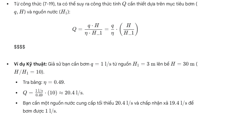 • Ví dụ Kỹ thuật: Giả sử bạn cần bơm $q = 1 \text{ l/s}$ từ nguồn $H_1 = 3 \text{ m}$ lên bể $H = 30 \text{ m}$ ($H/H_1 = 10$).